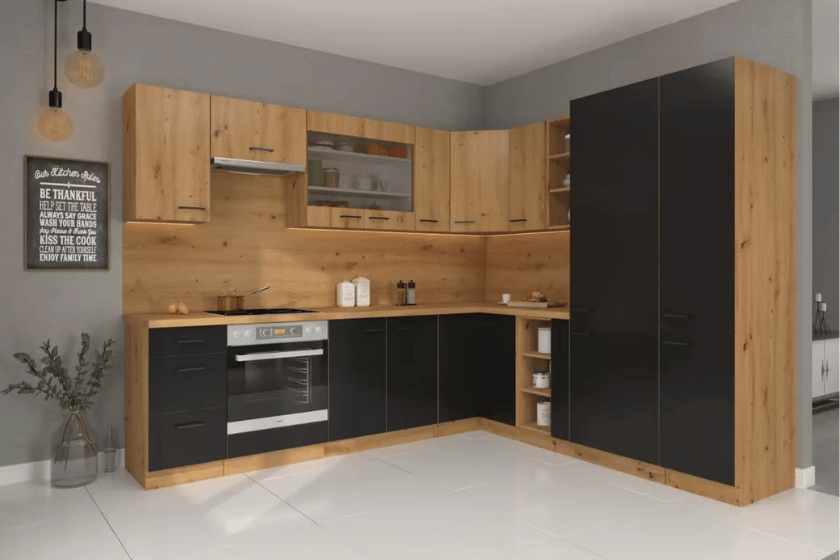 Nemusíte se držet striktně černé barvy na všech plochách. Právě naopak – kontrasty dokážou malé prostory krásně oživit. Zkombinujte černé skříňky s bílou nebo dřevěnou pracovní deskou. Mezi horními skříňkami a linkou použijte světlé obklady nebo dekor, který zapadne do stylu celé kuchyně. Tím dosáhnete zajímavého vizuálního efektu a kuchyň nebude působit těžce.