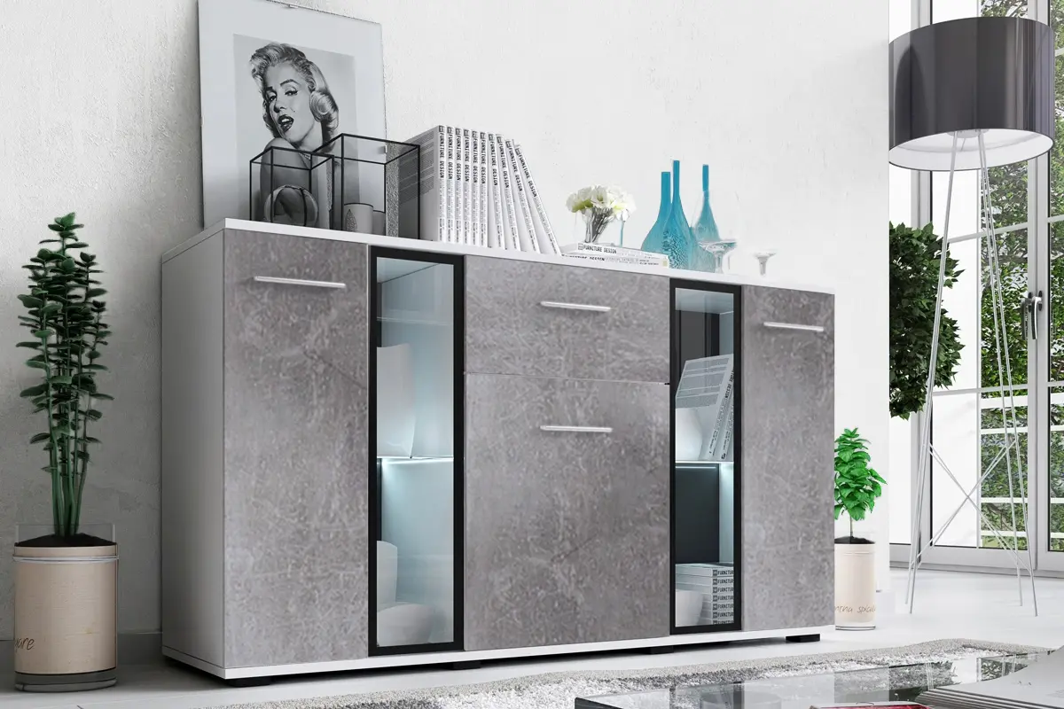 Dekory a povrchové úpravy s dekorem betonu byly donedávna charakteristické pouze pro interiéry zařízené v souladu s industriálním stylem. Není divu, protože beton je již mnoho let základní povrchovou úpravou stěn a podlah v loftech. Jak se trend tohoto stylu interiérového designu a eklekticismu rozšířil, beton začal být vítán i v jiných konceptech interiérového designu. Dnes jej rádi použijeme i v aranžmá v moderním, skandinávském, eklektickém a jiném stylu. Beton je velmi univerzální, takže se skvěle hodí nejen k různým stylům, ale také k barevným kompozicím. Může být základem pro vzorované, barevné, ale i minimalistické aranžmá. V současnosti se trend betonu objevil i v nábytkářském průmyslu. Můžeme si tedy vybrat mezi efektními tvary s betonovým dekorem na čelech. Oblíbené jsou především komody v betonové barvě.