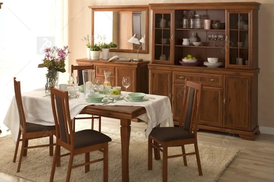 stylu. Proto měli bychom vybrat masivní stůl, těžké ozdobné židle, a také dekorační vitríny. Zdobené regály na