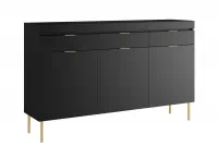 Černý matný povrch v kombinaci se zlatými detaily vytváří luxusní a moderní vzhled, který zaujme na první pohled. Tato komoda se stane výrazným prvkem v každém obývacím pokoji, jídelně, ložnici nebo předsíni. Její sofistikovaný design dodá vašemu prostoru eleganci a styl.