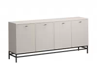 Robustní konstrukce z melaminové desky o tloušťce 16 mm a přední části z 18mm MDF zaručují dlouhou životnost a odolnost při každodenním používání. Kovové nohy vysoké 20 cm dodávají komodě stabilitu i vizuální lehkost, zatímco ABS hrany chrání před poškozením. Čtyři dvířka s tichými ocelovými panty a čtyři vnitřní police nastavitelné ve třech úrovních poskytují dostatek prostoru pro vše potřebné.