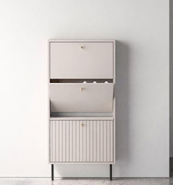 Skříň Nicole je vyrobena z kvalitní desky MDF, která je známá svou odolností a dlouhou životností. Drážkované přední části, sokl a ABS hrana zvyšují její pevnost a stabilitu. Kovové úchytky a ocelové panty s tichým zavíráním zajišťují plynulé a tiché zavírání dvířek.