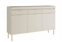 Design, který okouzlí na první pohled. Kombinace kašmírového korpusu a zlatých detailů dodává komodě luxusní vzhled, který se skvěle hodí do moderního i klasického interiéru. Zlaté nožky a úchytky podtrhují její sofistikovaný styl a přinášejí do každého prostoru nádech elegance.