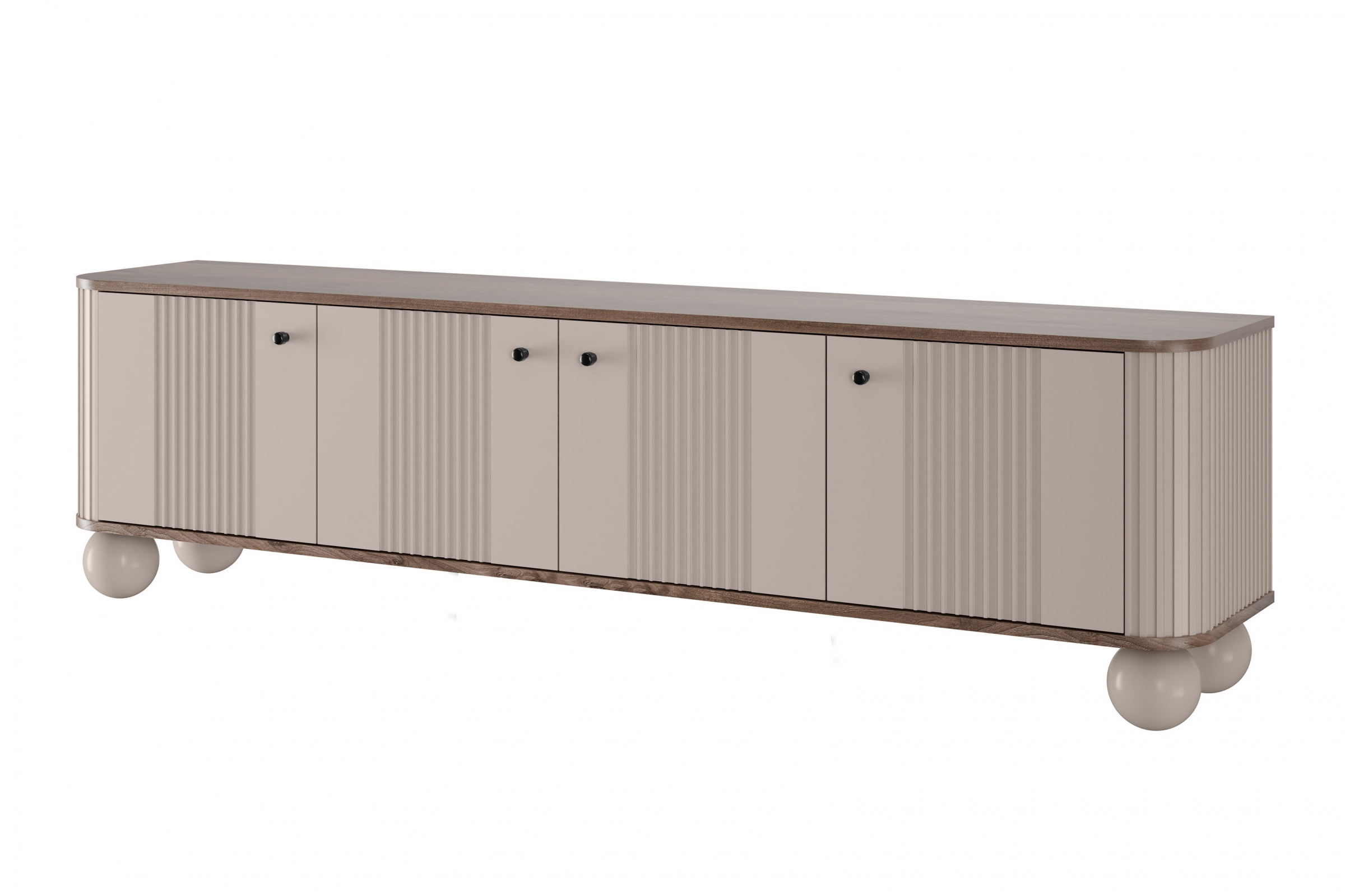 Hledáš perfektní TV stolek, který dodá tvému obývacímu pokoji moderní a stylový vzhled? Objev TV stolek Vesper 4D 187 cm - kašmírová / ořech / černé úchytky / kašmírové nožky koule.