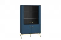 Tato vitrína v tmavě modré barvě s zlatými nožkami je skvělým doplňkem do každého moderního interiéru. Její elegantní design a vysoká kvalita provedení z laminované desky a skla zaručují, že bude okamžitě upoutávat pozornost.