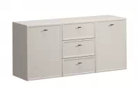 Praktické rozměry 150 x 70 x 45 cm a možnost zavěšení na zeď šetří místo a usnadňují úklid podlahy. Dvě skříňky, tři zásuvky a dvě výškově nastavitelné police uvnitř umožňují snadno rozdělit a uložit vše potřebné – od dokumentů až po nádobí nebo oblečení. Tiché zavírání zásuvek a dvířek oceníte hlavně v domácnosti s dětmi nebo při večerním provozu.